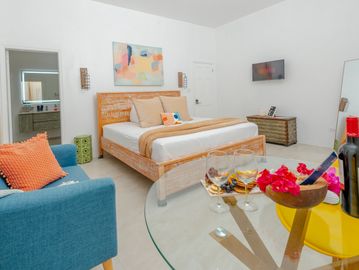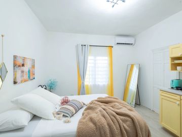 A cozy, self-contained getaway designed for relaxation. Enjoy a plush king bed, AC, a full kitchen, and a bathroom with a refreshing rain shower. Stay connected with WiFi and make use of the in-room washer and dryer. A multifunction dining table offers space for meals or work.