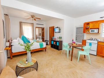 A cozy upstairs retreat with a queen bed, WiFi, AC, and a spacious bathroom with a rain shower. The kitchenette includes a mini fridge/freezer, two-burner stovetop, microwave, and small appliances. A multifunctional dining table provides space for meals or work, and guests have access to a shared laundry room and a large wraparound porch to enjoy the island breeze.